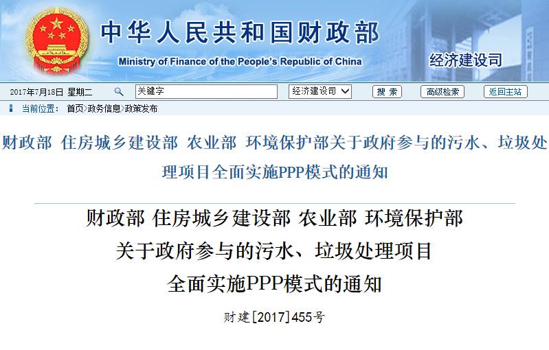 财政部、住建部、农业部、环境保护部近日印发《关于政府参与的污水、垃圾处理项目全面实施PPP模式的通知》,指出进一步规范污水、垃圾处理行业市场运行,提高政府参与效率,充分吸引社会资本参与,促进污水、垃圾处理行业健康发展。